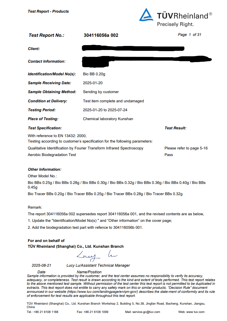 Tests are done by TUV Rheinland, and confirm we are truely Biodegradable, every, single, shot.